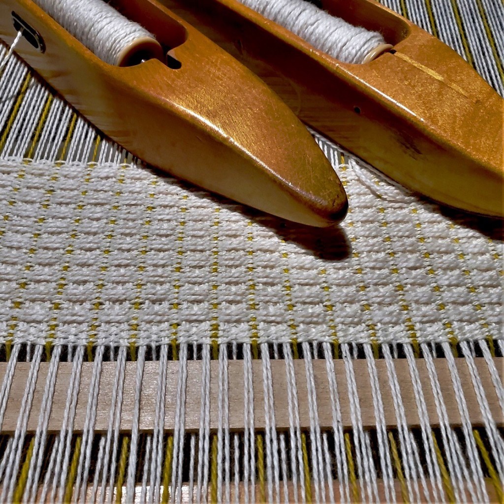 This being the second scarf with this draft, I wanted to pop-out the texture more. 2 Shuttles, 2 Yarns, 4 Shafts, 5 Treadles and 2 Left Feet. Dyed Buckthorn Berry Yarn, Natural Cotton, Dried Buckthorn Berries.