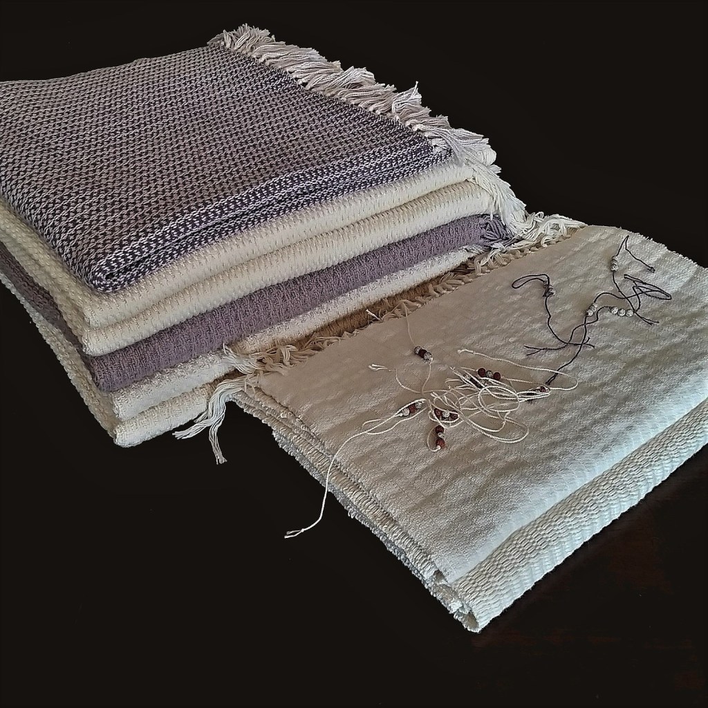 This meditation rug (31″x32″) is quilted and stitched in the “Kantha” style of embroidery. Floor Loom Woven, Natural Dyes and Hand Stitched. The handwoven panels are 100% American Cotton, one dyed with Aleppo oak gallnuts. The batting is also 100% American cotton. The cotton yarn for stitching was dyed with buckthorn berries.
