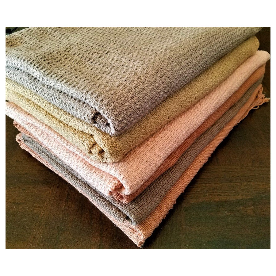 While weaving the latest group of security blankets, I decided to add some color to a couple of the blankets. The darker purple is a dye bath at ph-10. The lighter was taking the same bath and adding chalk powder. Natural cotton dyed with logwood.