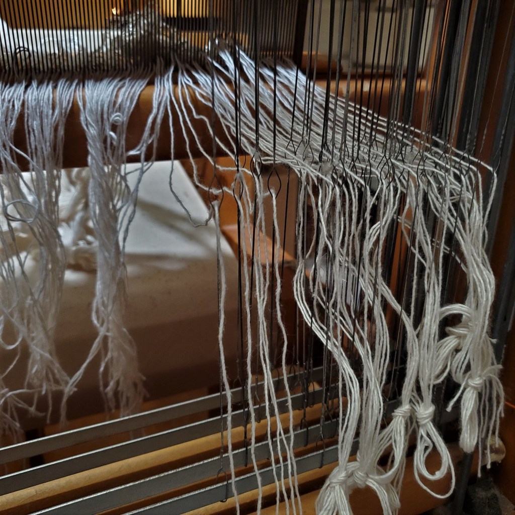 Made to order single ply cotton yarn. 18 threads per inch X 45″ X + 2 floating salvage threads at each end = 814 threads by 8 yards.