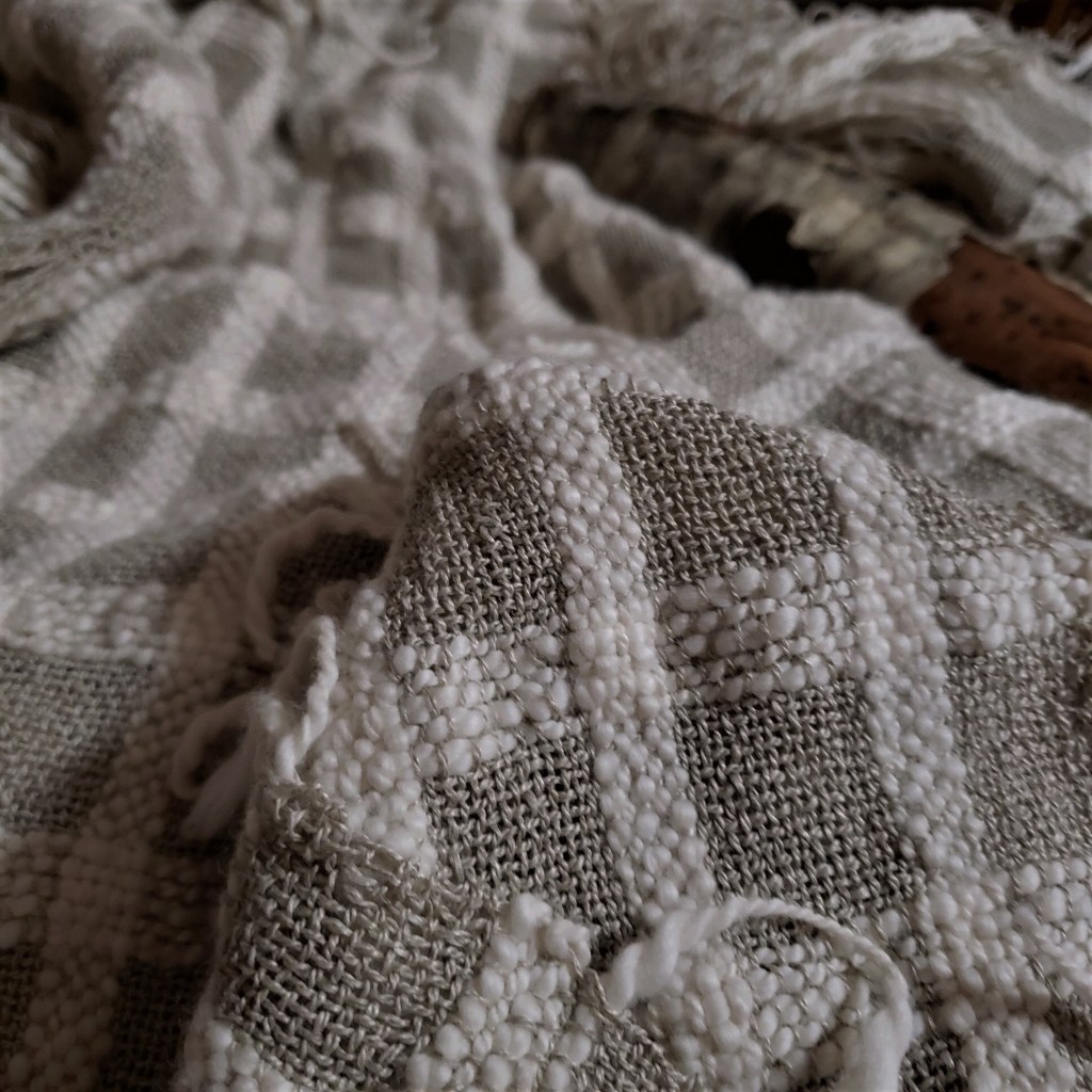 Off the loom and ready for fringing then maybe some pigment paint to give it some color. This will be a tough decision on what style of fringe to use. Organic Bast Fiber Scarf. Imported Organic Hungarian Linen & Imported Organic Wild Himalayan Nettle Fiber.