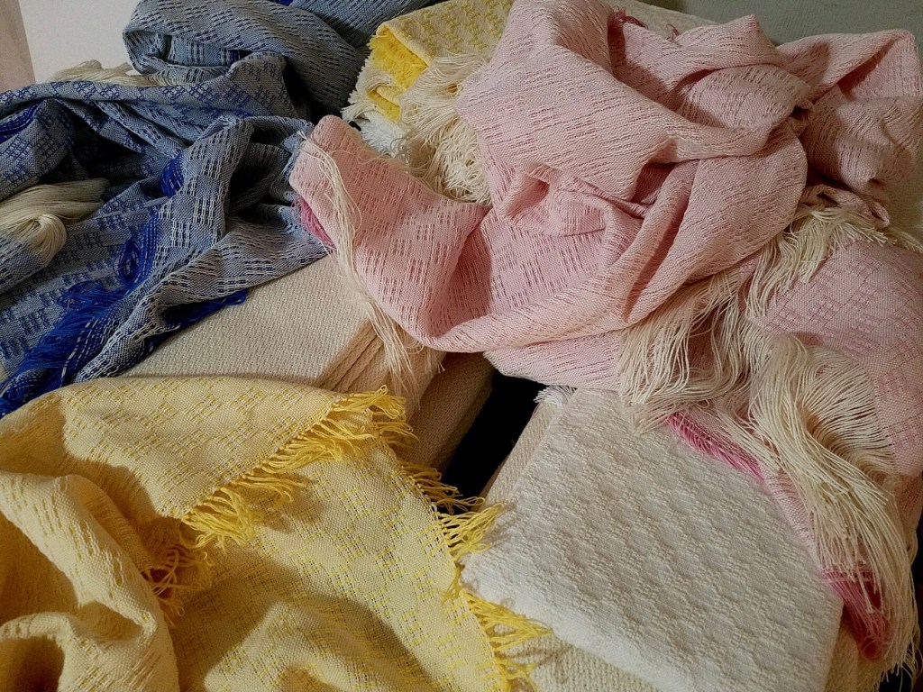 In the picture on the left, the two on the bottom are a light and heavy weight throws, cut of the loom. The two above them have been wet finished.