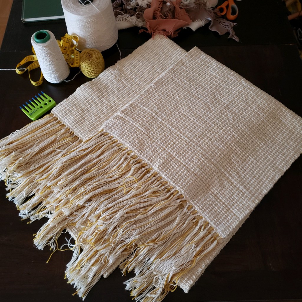 In the picture is two future blankets being warped up on the loom (end to end). The loom is 60″ wide and this is about 4600 yards of cotton (+/- 2.5 miles). That amount of warp will weight approximately 3.5 pounds. Being twice as lone as wide, after weaving the two blanket the gross amount will be about 10 pounds. With the waste of the tie up at each end and between of the blankets, they will finish out at more than 4 pounds each.