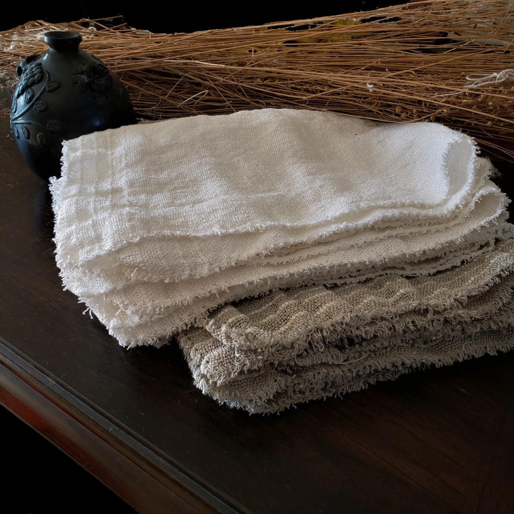 Organically grown Hungarian flax that was milled in Belgium into yarn. Floor loom woven and hand finished edging with fraying to keep the rustic feeling.