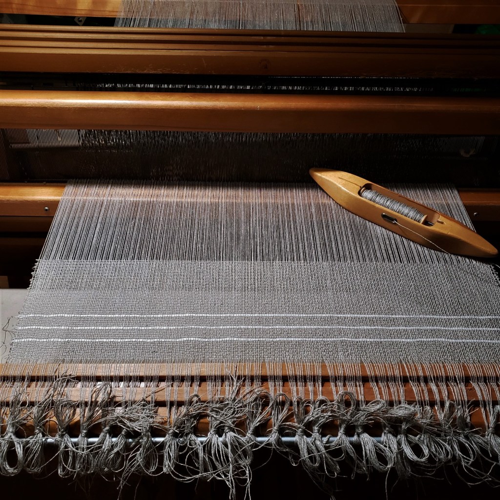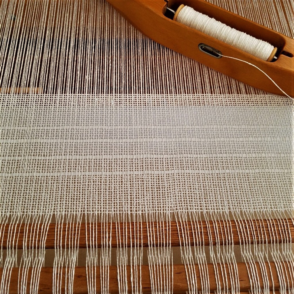 These are woven strips of American organic cotton. I am starting to bind the strips together to make a "Kente " style woven throw. It will ether be finished by hand stamping or hand painting. Floor Loom Woven American Organic Cotton Strips, Organic Egyptian Cotton Thread for Binding.